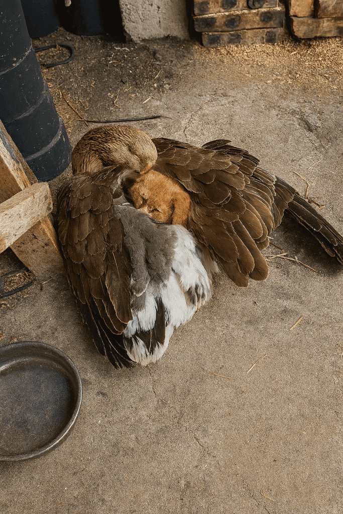 És a kiskutya megértette. Odamászott. Bújt. És… elaludt. Mert ott, abban a pillanatban, a hideg kövön, egy liba szárnyai alatt megtalálta azt, amit addig senki nem adott meg neki: biztonságot.