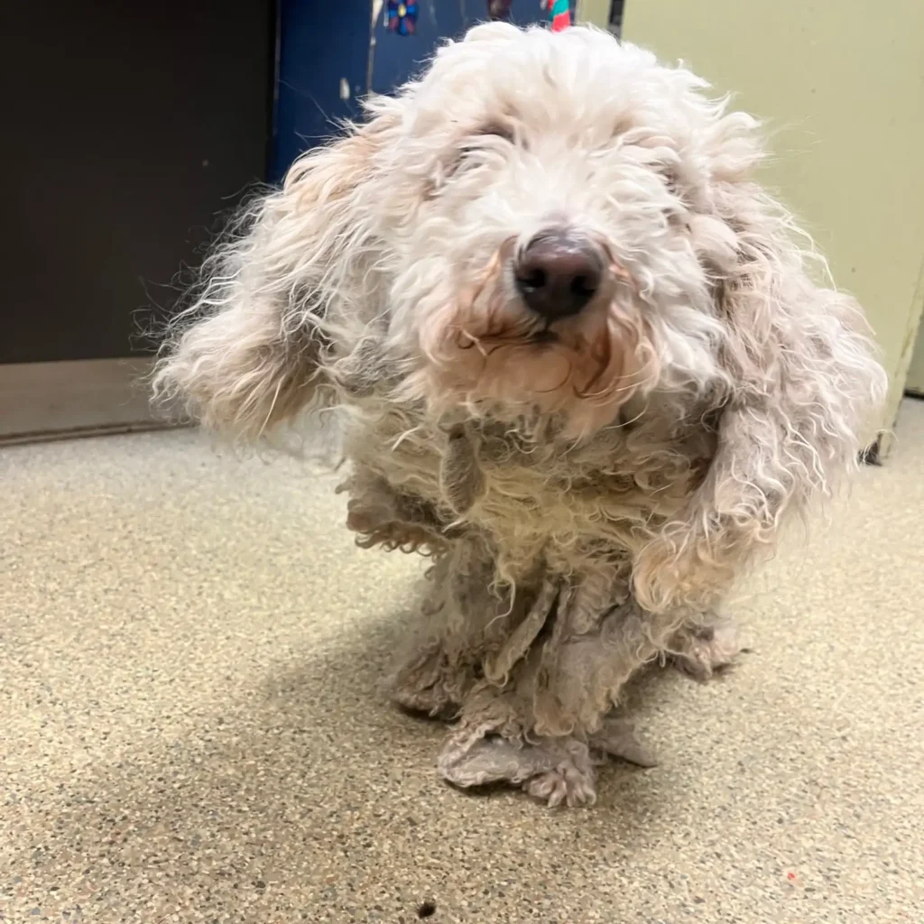 A kistermetű, göndör szőrű kutyát szó szerint alig lehetett felismerni. Vastag, összecsomósodott szőrrétegek borították a testét, mintha egy fájdalmas páncélt viselne. A szőre annyira összeállt, hogy szinte burokba zárta. Amikor az önkéntesek bevitték az épületbe, merev volt, mintha minden mozdulat kínnal járna.